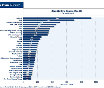 WeiterlesenDer Spiegel ist das meistzitierte Medium im ersten Quartal 2012. Die im Vorjahresquartal erstplatzierte Bild-Zeitung folgt aktuell auf dem zweiten...