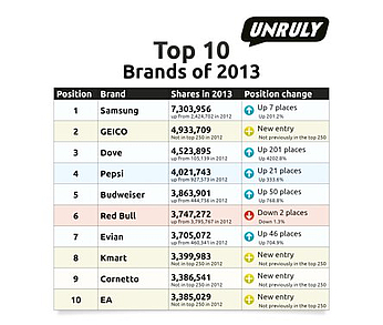 WeiterlesenSamsung ist laut Unruly die erfolgreichste Marke des Jahres im Bereich Social Video. Die Video-Kampagnen des Technologie-Riesen wurden in 2013 laut...