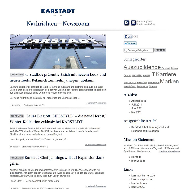 Unabhängig von dem Relaunch von karstadt.de geht auch das neue Nachrichtenportal von Karstadt an den Start. Unter www.karstadtnachrichten.de stehen ab sofort Informationen aus dem ganzen Unternehmen und aus allen Regionen und Bereichen zur Verfügung.