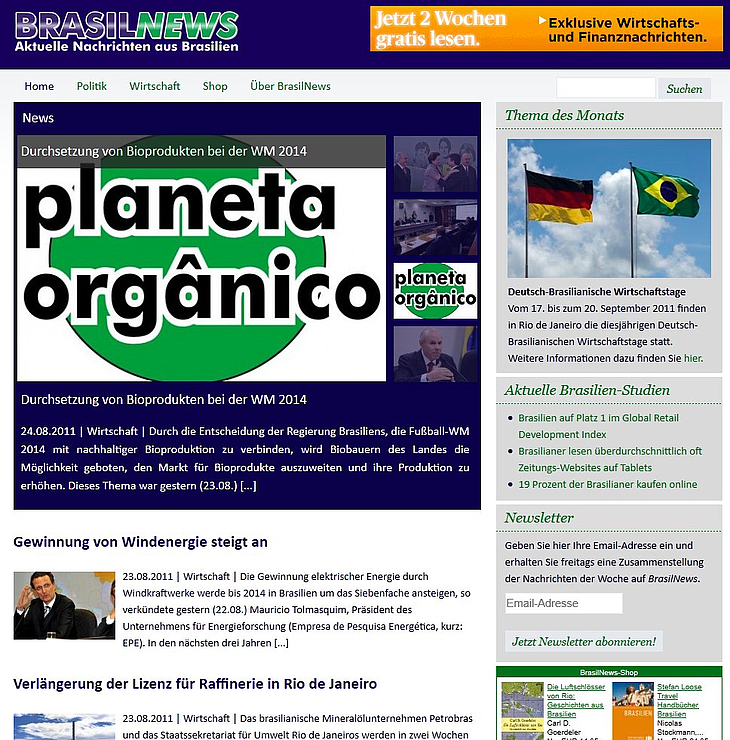 Das neu gestartete Portal BrasilNews ist die einzige Nachrichtenwebsite in Deutschland, die täglich von Montag bis Freitag in deutscher Sprache über aktuelle Ereignisse in Brasilien informiert. Die BrasilNews-Redaktion sucht täglich vier wichtige News aus mehreren brasilianischen Qualitätsquellen aus und erstellt eigene Meldungen auf Deutsch. BrasilNews konzentriert sich dabei auf Nachrichten in den Segmenten Politik sowie Wirtschaft und richtet sich an deutsche Entscheidungsträger, die am brasilianischen Markt interessiert sind.