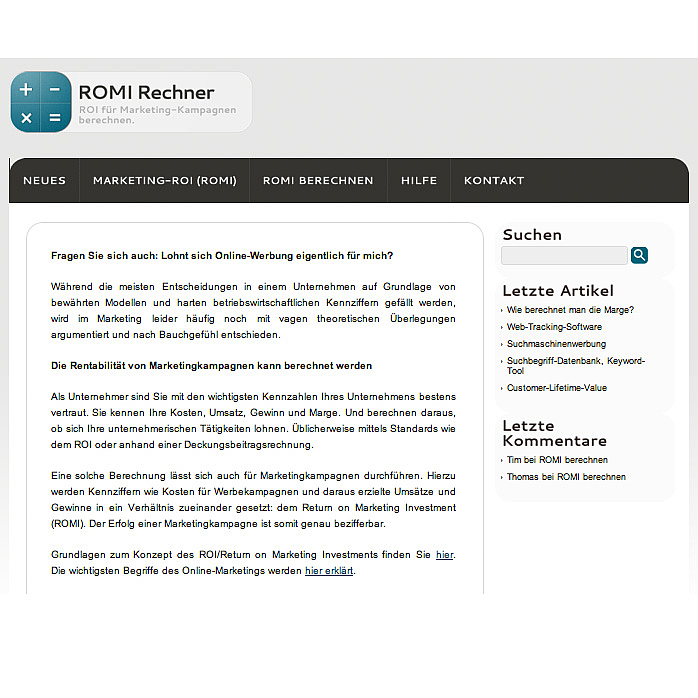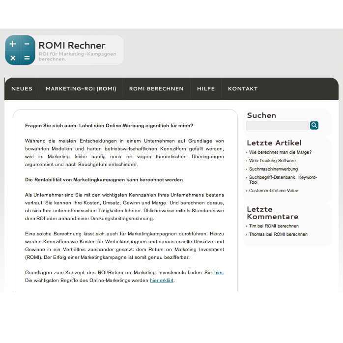 Das Rechentool unter http://romi-rechner.de soll hier Abhilfe schaffen: Durch Eingabe von Unternehmenskennzahlen wie Umsatz, Gewinn und Marge kann jeder Unternehmer berechnen, ob Online-Marketing für sein Geschäftsmodell ein positives, neutrales oder auch negatives Ergebnis erwirtschaftet. Zudem kann die optimale Höhe des Werbebudgets ermittelt werden. Die Berechnungen ruhen dabei auf dem Konzept des "Return on Marketing Investment", das die Werbekosten in ein direktes Verhältnis zu dem durch Marketing erwirtschafteten Gewinn setzt. "Das Besondere ist, dass sich damit häufig schon vor Start einer Kampagne prognostizieren lässt, ob Online-Werbung im Marketingmix eines Unternehmens überhaupt sinnvoll sein kann. Während diese Vorgehensweise in den USA bereits Standard ist, hinkt der deutsche Werbemarkt hier immer noch hinterher. Unseres Wissens nach, ist dieses Tool einzigartig in Deutschland.", sagte Tim Lilling weiter.
