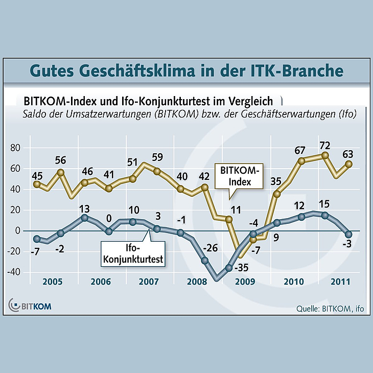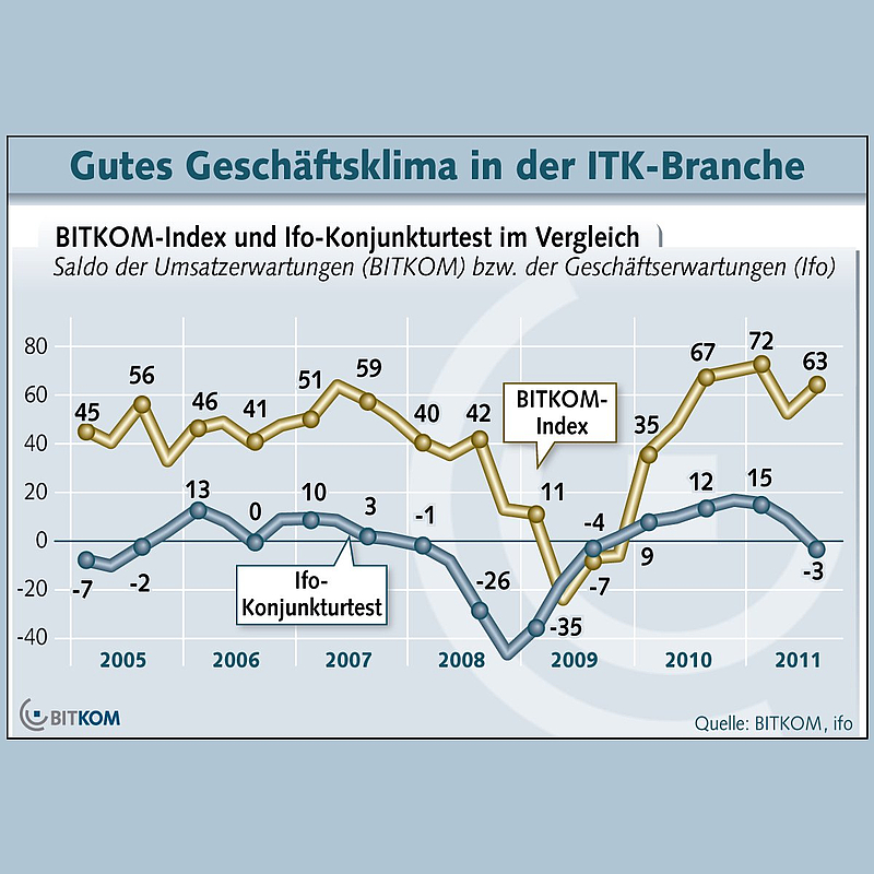 Danach erwarten drei Viertel der Anbieter von Informationstechnik, Telekommunikation und Unterhaltungselektronik steigende Umsätze im Vergleich zum Vorjahresquartal. Der BITKOM-Branchenindex steigt um elf auf 63 Punkte.