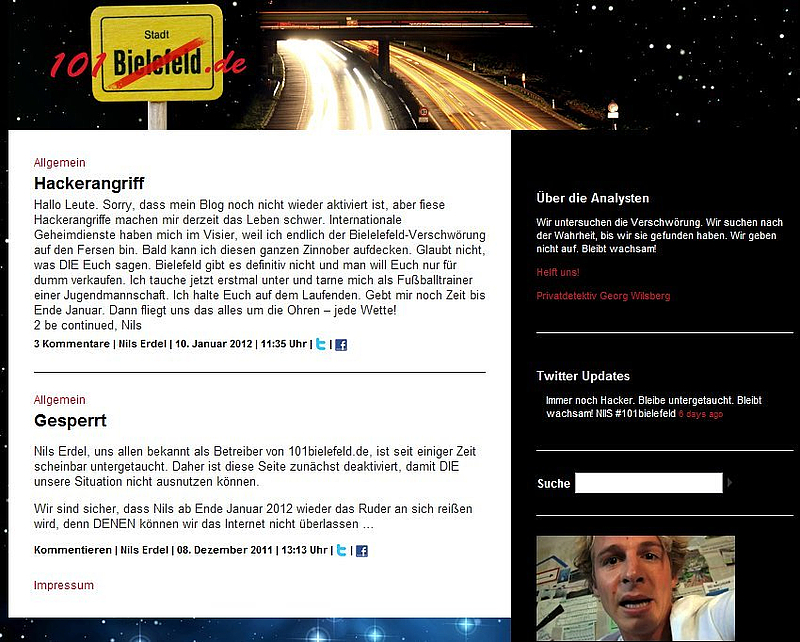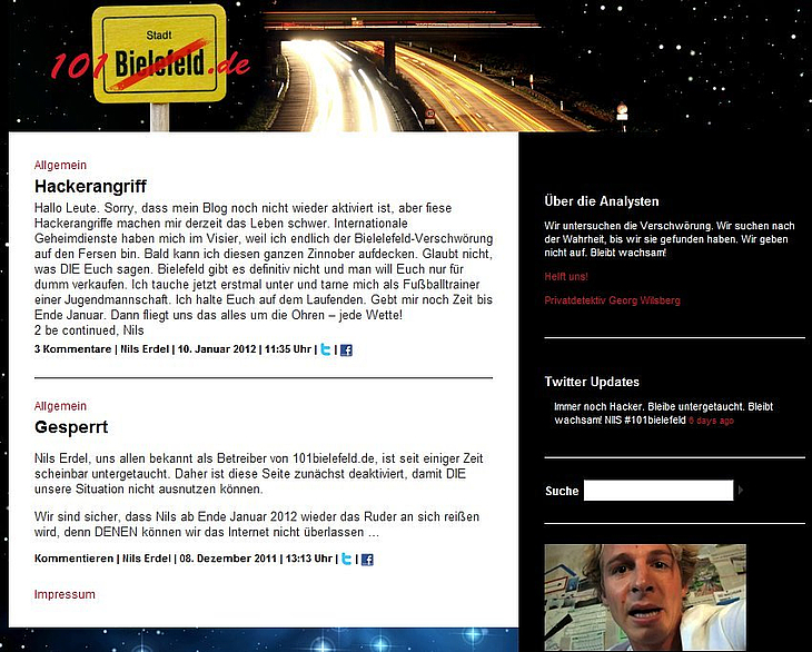 Auf Nils' fiktivem Blog www.101bielefeld.de können sie Hinweise für die (Nicht-)Existenz Bielefelds liefern und kleine Aufgaben und Rätsel lösen. Ob das allerdings ausreicht, um Nils davon abzuhalten, in sein Verderben zu rennen, ist fraglich. Davon erzählt dann der zweite "Wilsberg"-Film. Die beiden Samstagskrimis sind auch ohne dieses Internet-Intermezzo und unabhängig voneinander zu verstehen. Wer die Verschwörung im Internet versäumt, verpasst aber die Chance, selbst Teil der Handlung zu werden und Nils Erdel bei seiner Mission zu unterstützen.