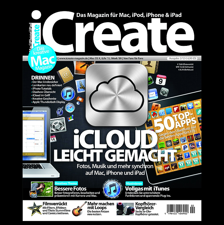 In der Titelgeschichte erläutert die Redaktion das Potenzial des Speicherdiensts iCloud. Außerdem präsentiert iCreate die „50 Top-Apps“ für das Betriebssystem iOS, zeigt, wie man den Mac kindersicher macht, wie man die Funktionen des Multimedia-Programm iTunes ausreizt und vieles, vieles mehr.