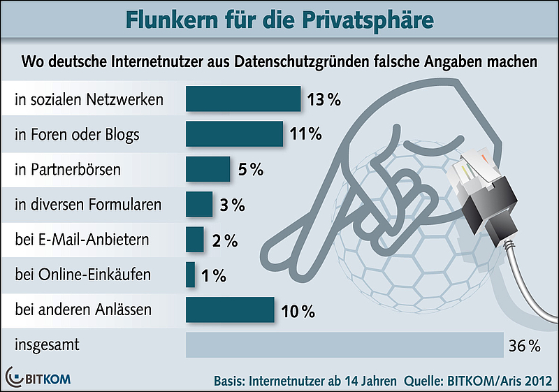 Vor allem in sozialen Netzwerken (13 Prozent) und Foren (11 Prozent) flunkern Anwender aus Datenschutzgründen. In Partnerbörsen (5 Prozent) und diversen Formularen (3 Prozent) sind Falschangaben zum Schutz der eigenen Daten weniger ausgeprägt. Je jünger die Nutzer, desto eher machen sie nicht alle Angaben wahrheitsgemäß. So haben 44 Prozent der 14- bis 29-Jährigen im Netz geflunkert, aber nur 25 Prozent der Internetnutzer ab 65 Jahren.