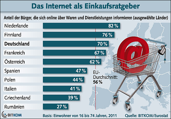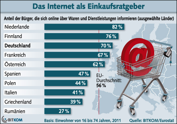 Im EU-Vergleich liegen Deutschland mit 70 und Österreich mit 62 Prozent über dem EU-Durchschnitt von 56 Prozent. Spitzenreiter sind jedoch die Niederlande, wo sich 82 Prozent der Bürger online über Waren und Dienstleistungen informieren. Auch in skandinavischen Ländern sehen Verbraucher vor einem Kauf eher im Web nach als in Deutschland. In den süd- und südosteuropäischen Ländern nutzen dagegen weniger Verbraucher das Internet als Informationsquelle. Schlusslicht ist Rumänien mit 27 Prozent.