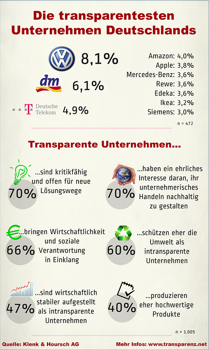 Das ergab eine Studie der Frankfurter Kommunikationsberatung Klenk & Hoursch AG. Zum ersten Mal wurden deutsche Verbraucher ungestützt gefragt, welche Unternehmen sie als besonders transparent wahrnehmen.