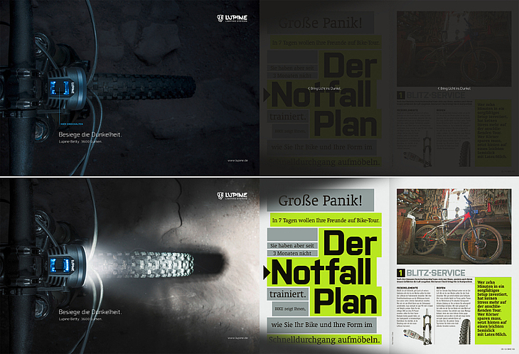 Textlich unterstützt durch den Lupine-Claim „Besiege die Dunkelheit“ werden dem Leser interaktiv so schnell die Vorteile des Produkts klar. Über Facebook kann die Aktion von den BIKE-Lesern darüber hinaus schnell mit Freunden geteilt werden.