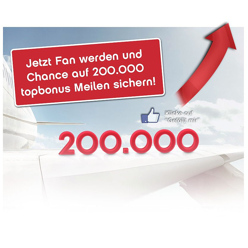 airberlin CCO Paul Gregorowitsch erläutert: "200.000 Likes zeigen, dass unsere Gäste diesen Service zu schätzen wissen! Als Dankeschön an unsere Fans verschenken wir nun zum ersten Mal im Social Web topbonus Meilen."