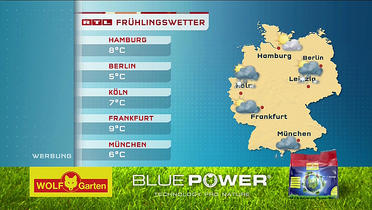 Die TV-Kampagne beeinflusste die Kaufbereitschaft: 43 Prozent der Zuschauer würden beim Gang in den Baumarkt oder ins Gartencenter aufgrund der Werbung BluePower in den Einkaufswagen packen. Laut einer Abverkauf-Umfrage von IP Deutschland war für jeden dritten BluePower-Käufer die TV-Werbung ausschlaggebend für den Einkauf des Rasendüngers. Zur Kampagne WOLF-Garten bewarb den neuen BluePower Rasendünger im April 2013 mit dem Newscountdown und individuellem Wettersplit im Umfeld von "RTL Aktuell". Beim Newscountdown lief der Werbespot für BluePower im Splitscreen, während im redaktionellen Rahmen die verbleibenden Sekunden bis zur Nachrichtensendung eingeblendet wurden. Das individuelle Wetter wurde ebenfalls vor der Nachrichtensendung ausgestrahlt, hier begrünte WOLF-Garten mit einem Banner den unteren Bildschirmrand.
