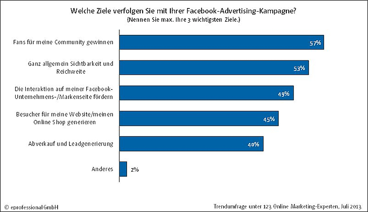 So sagten 54 Prozent der Befragten, dass sie Werbung auf Facebook schalten. Von diesen gaben allerdings 43 Prozent an, dass sie die Targetingfunktionen gar nicht oder nur unzureichend kennen. Als wichtigstes Ziel für Werbekampagnen auf Facebook nannten 57 Prozent der Befragten die Gewinnung von mehr Fans für die Community. Dahinter folgt mit 53 Prozent die ganz allgemeine Sichtbarkeit und Reichweite des Unternehmens oder der Marke. 49 Prozent möchten mit ihrer Kampagne die Interaktion auf ihrer Facebook Page fördern und 45 Prozent Besucher für ihre Webseite oder ihren Online-Shop generieren.