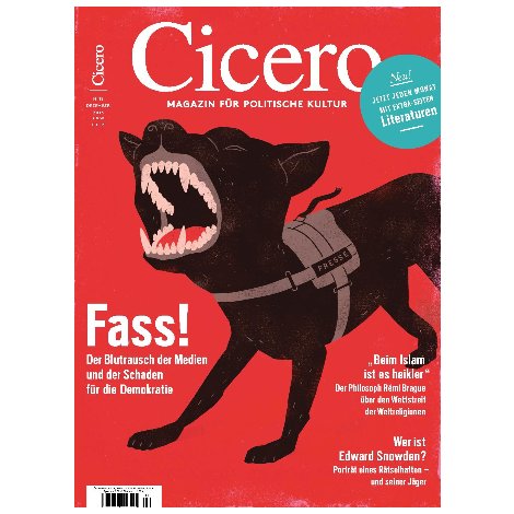 Cicero-Chefredakteur Schwennicke und seine Art-Director-Kollegin Schmieskors haben mit dem Cover und ihrer Titel-Geschichte die eigene Branche ins Visier genommen und den "Blutrausch der Medien" analysiert und als zähnefletschende Bestie auf dem Cover abgebildet.