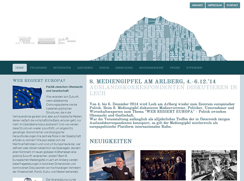 Der Europäische Mediengipfel am Arlberg, der von der Kommunikationsagentur pro.media kommunikation 2007 initiiert wurde, wird neben der Lech Zürs Tourismus GmbH vor allem von der Telekom Austria Group, d. swarovski tourism services gmbh sowie von Medienpartnern, wie dem Verband der Auslandspresse in Österreich und Deutschland, ORF, APA - Austria Presse Agentur, news-aktuell, Der Standard, NZZ-Neue Zürcher Zeitung, Presseclub Concordia und Vorarlberger Medienhaus, getragen.