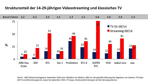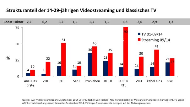 Diese Abwanderer finden sich beim nonlinearen TV-Konsum wieder. So liefern die Streaming-Daten, die die AGF seit Jahresanfang erhebt und auf der Website (www.agf.de) ausweist, erste belastbare Erkenntnisse zur komplementären Nutzung von Bewegtbildinhalten: Die Altersgruppe der 14- bis 29-Jährigen, die in der klassischen TV-Nutzung meist geringere Struktur-Anteile aufweist, ist dagegen bei der Streamingnutzung überproportional stark vertreten.