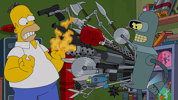 Der andere ist ein silberner Roboter namens Bender und bewegt seinen blanken Metall-Hintern in "Futurama" durch das Neu New York des 31. Jahrhunderts. In der 26. Staffel von "Die Simpsons" treffen die beiden Kultstars von Schöpfer Matt Groening in einem gefährlichen Showdown zum ersten Mal aufeinander ...