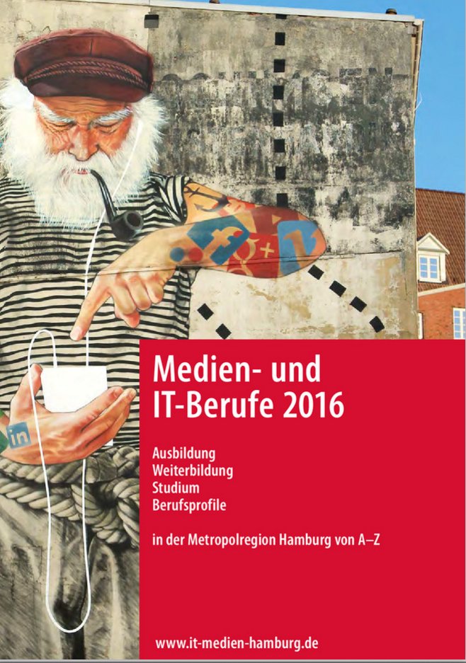 Die neue Ausgabe „Medien- und IT-Berufe 2016“ enthält in kompakter Form Informationen zu Studienmöglichkeiten sowie Aus- und Weiterbildung in den Bereichen der IT-, Medien-, Werbe-, Verlags-, Kreativ- und Eventbranche. Das Handbuch bietet Schülerinnen und Schülern, Beschäftigten und Unternehmen hilfreiche Orientierung im Berufsfeld Medien und IT: Über 200 Berufsprofile werden erläutert und sind mit Hinweisen zu den jeweiligen Hamburger Bildungsanbietern sowie branchenspezifischen Adressen versehen.