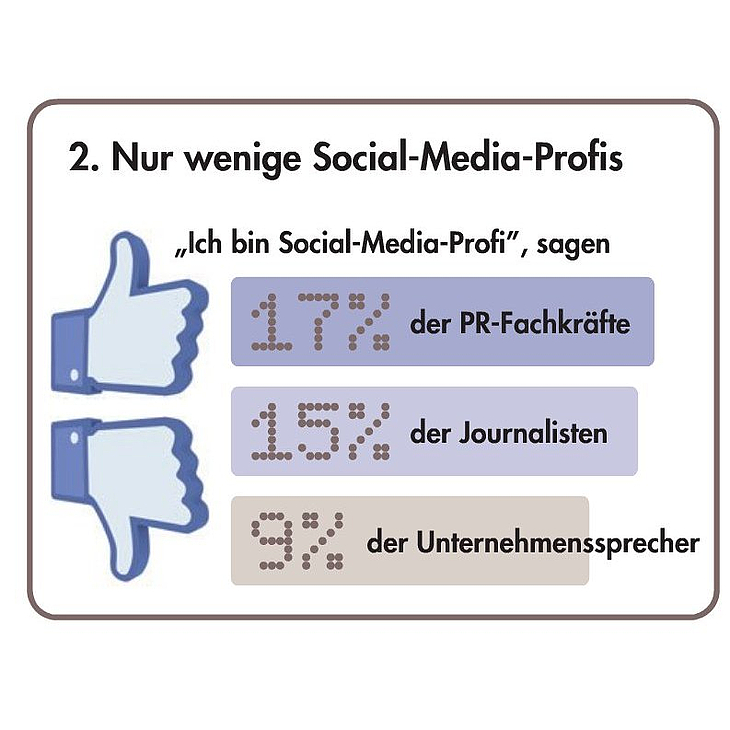 In Pressestellen und PR-Agenturen ist die Begeisterung noch größer. Mehr als die Hälfte aller PR-Profis setzt Social Media inzwischen im Arbeitsalltag ein (Pressestellen: 54 Prozent; PR-Agenturen: 62 Prozent). Allerdings zeigt die Studie auch, dass "wertvolles Arbeitswerkzeug" in den Redaktionen nicht gleichbedeutend ist mit "großer Relevanz" für die eigene Arbeit. Denn mehr als die Hälfte aller befragten Journalisten attestiert Social Media gleichzeitig eine "geringe" bis "gar keine Relevanz" (63 Prozent).