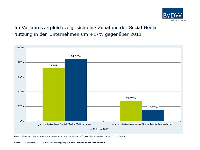 Die Mehrheit der durch den BVDW befragten Unternehmen ist sich einig darüber, dass sich ihre bisherigen Aktivitäten in Social Media gelohnt haben. Mehr als sechs von zehn Unternehmen (63 Prozent) bestätigen einen positiven Nutzen. Hingegen hat sich der Aufwand und Betrieb von Social-Media-Aktivitäten für nur rund fünf Prozent nicht gelohnt. Der Vorjahresvergleich verdeutlicht, dass dieser Anteil an Unternehmen insgesamt um 67 Prozent gesunken ist.