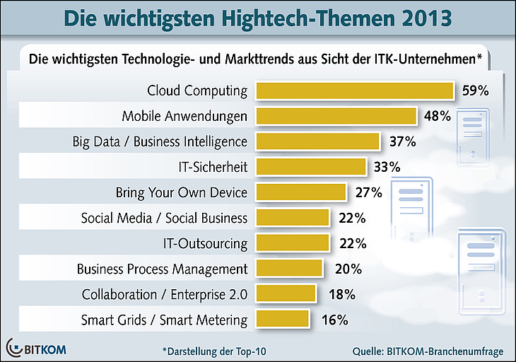 37 Prozent der befragten Unternehmen sehen Big Data als maßgeblichen Trend des Jahres. Spitzenreiter ist wie in den Vorjahren Cloud Computing mit 59 Prozent der Nennungen, gefolgt von mobilen Anwendungen mit 48 Prozent. Ein Dauerbrenner bleibt mit 33 Prozent das Thema IT-Sicherheit.