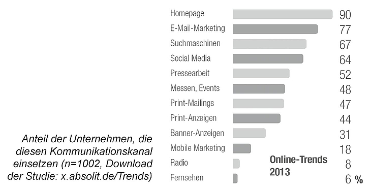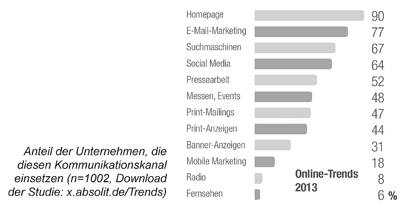 Social Media Marketing ist von Platz 5 auf Platz 4 gestiegen: Waren es letztes Jahr noch 62 Prozent, so sind es inzwischen 65 Prozent der Unternehmen, die im Social Web aktiv sind. Mobile Marketing ist am stärksten gewachsen: 22 Prozent setzen es ein – im letzten Jahr waren es nur 15 Prozent. Der Pressearbeit wird weniger Bedeutung geschenkt. Letztes Jahr mit 64 Prozent noch auf Rang 4, ist das Thema auf Rang 5 abgerutscht. Nur 55 Prozent setzen auf PR, zehn Prozent weniger als 2012.