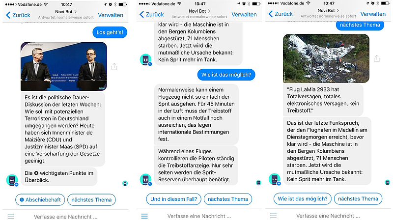 „Für uns ist es spannend, neuartige Möglichkeiten in der direkten Kommunikation mit unseren Nutzern über einen Bot zu erschließen. Nachrichten können im Chat mit Novi direkt abgefragt werden, auch über die Freitext-Eingabe. Das ist eine völlig neue Art der Nachrichtennutzung, von der wir glauben, dass sie für unsere Zielgruppen spannend ist”, so Philipp Schild, Leiter Content-Team bei funk.