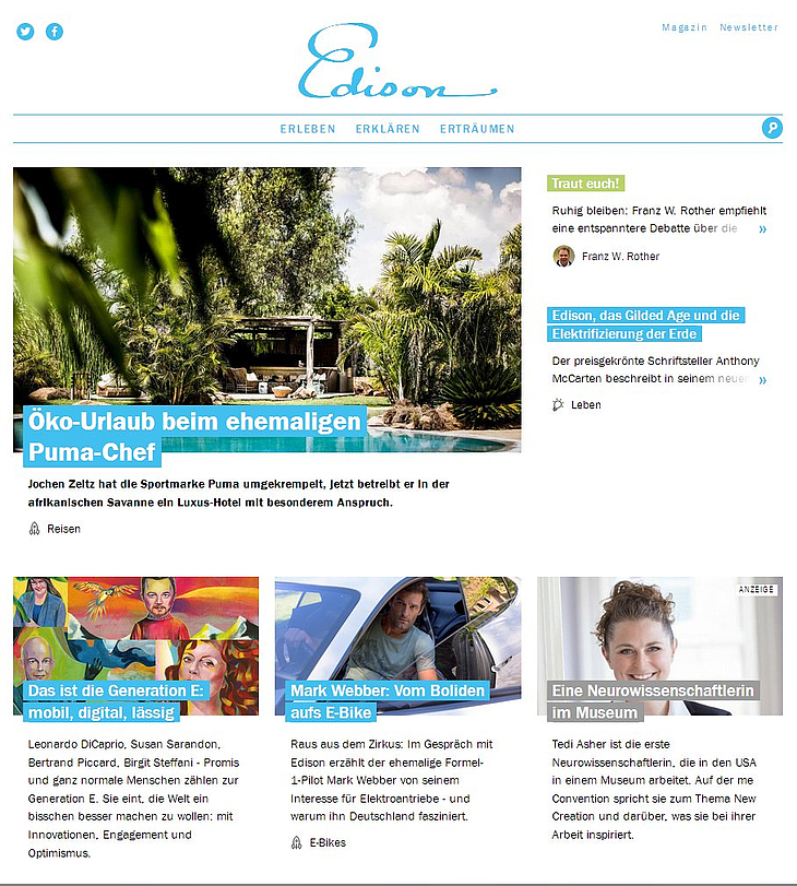 "Die zunehmende Elektrifizierung und stärkere Vernetzung der Systeme verändern nicht nur unser Mobilitäts- und Konsumverhalten, sondern schaffen auch einen neuen, ebenso smarten wie umweltschonenden Lebensstil", so "Edison"-Chefredakteur Franz W. Rother. Die Menschen dieser "Generation E" interessieren sich für Elektromobilität in jeder Ausprägung ebenso wie für Fragen zur regenerativen Energiegewinnung und Stromspeicherung, für neue städtebauliche und architektonische Konzepte sowie für Möglichkeiten, ihr berufliches wie privates Leben mit Hilfe des Internets und moderner Kommunikationsmittel zu vereinfachen.